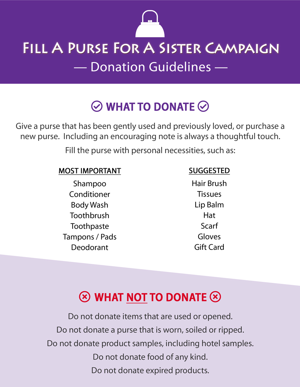 Fill a Purse For a Sister Campaign - Donation Guidelines (aka Do's & Don't) - JPG